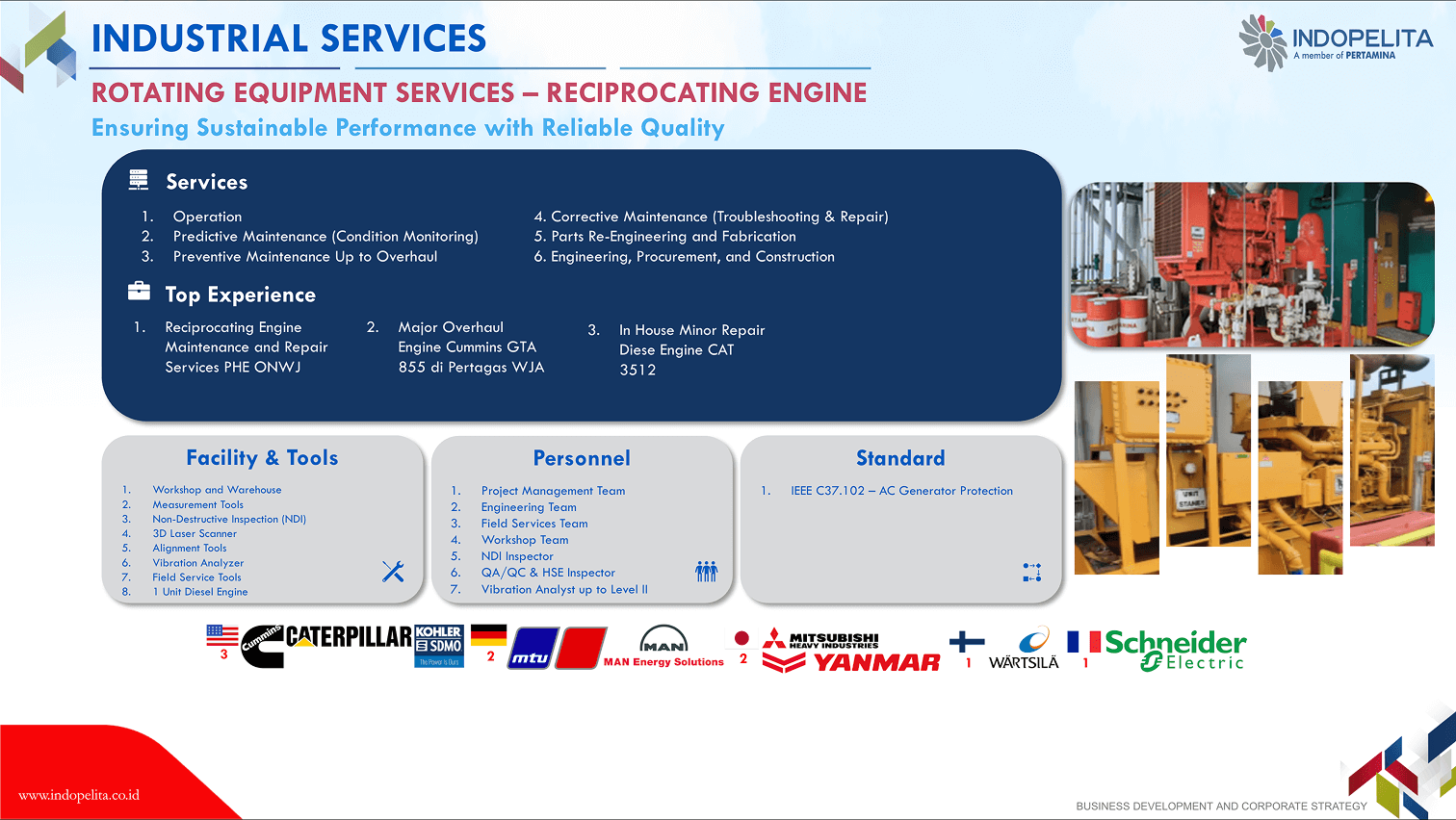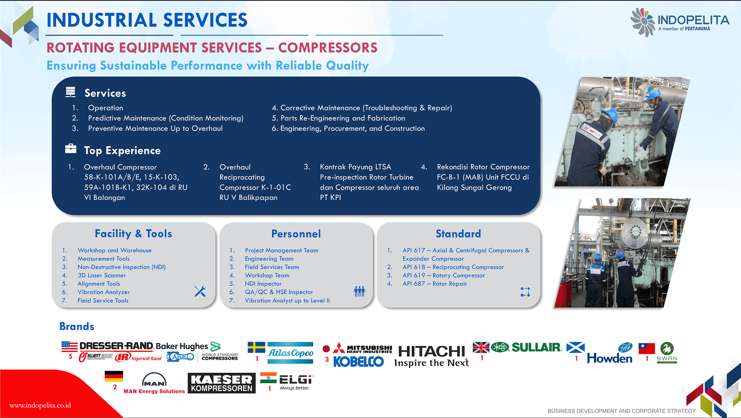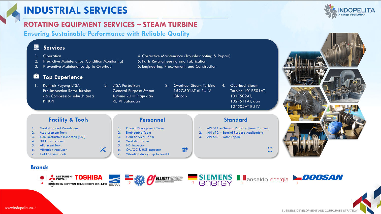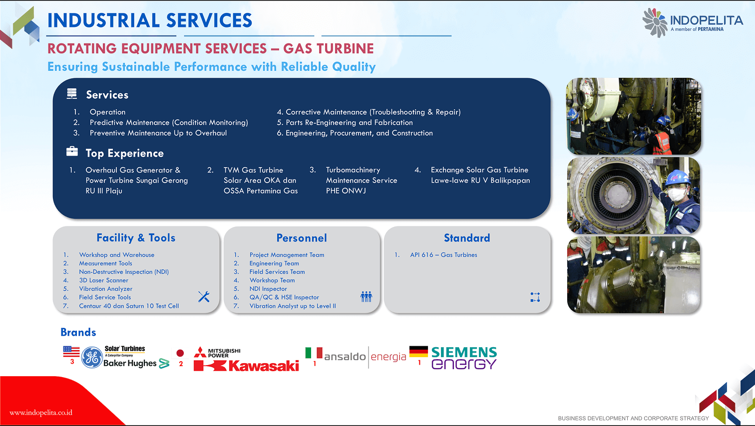 Rotating equipment has a vital function in the production chain of a company/an industry, thus its endurance shall be maintained to ensure the effectiveness and efficiency of industrial process. This means that a company shall conduct corrective, planned or productive maintenance properly. Our 30 years of experience in handling rotating equipment maintenance including overhaul maintenance, has built up our confidence as the specialist of choice in engine maintenance (gas turbine, gas engine, steam turbine, and diesel engine), pump and compressor.