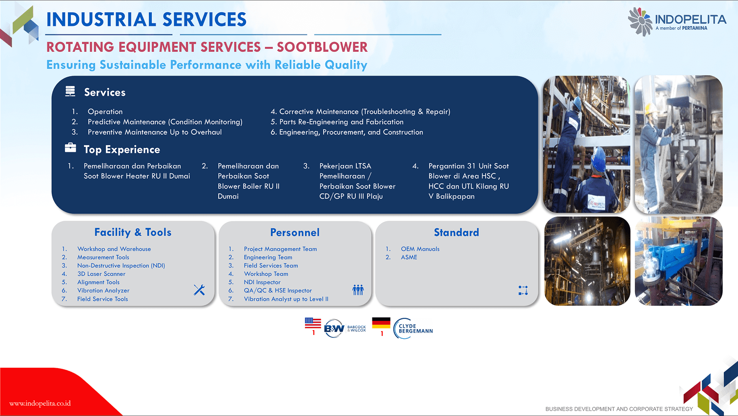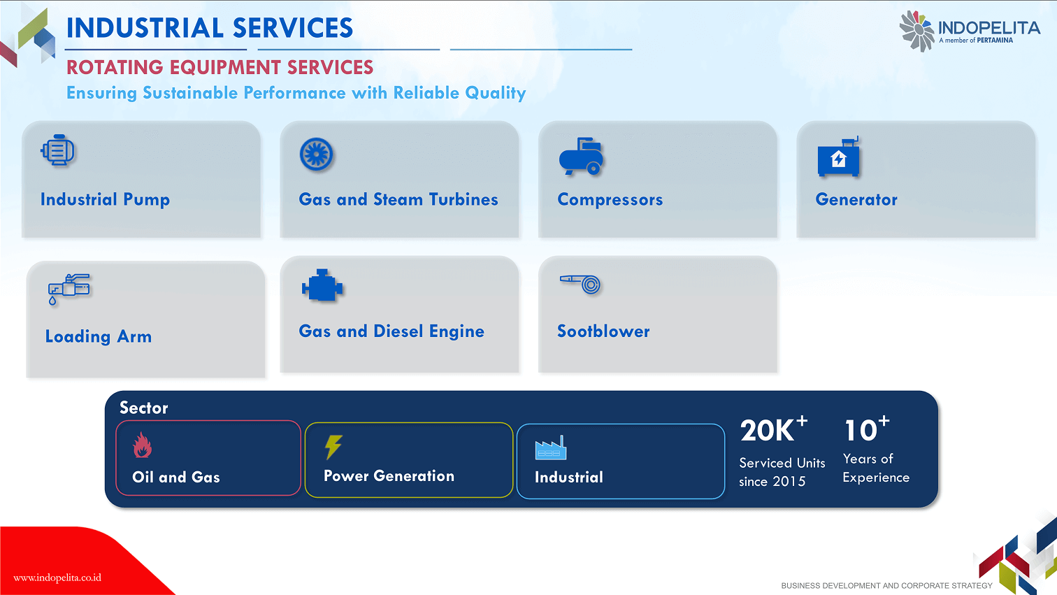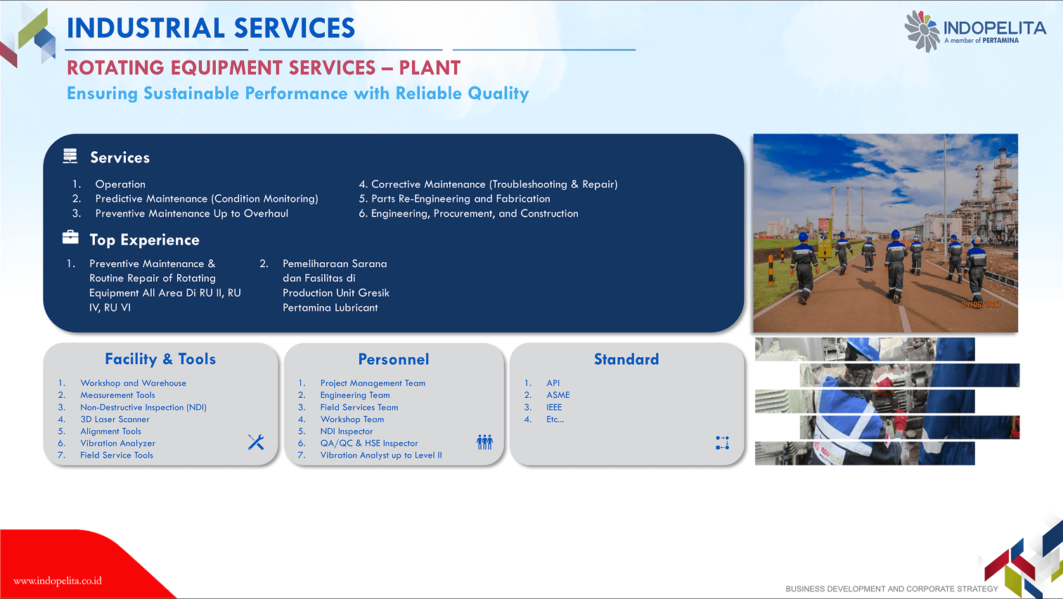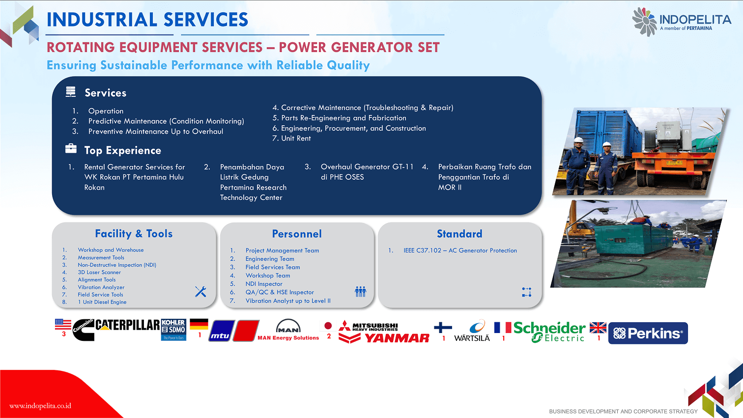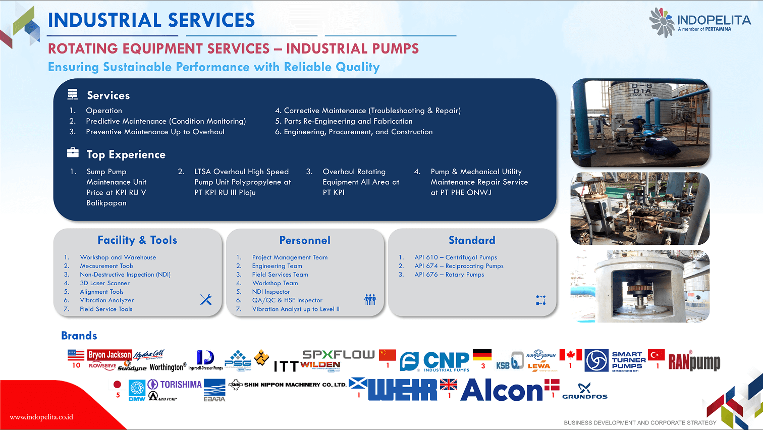 Rotating equipment has a vital function in the production chain of a company/an industry, thus its endurance shall be maintained to ensure the effectiveness and efficiency of industrial process. This means that a company shall conduct corrective, planned or productive maintenance properly. Our 30 years of experience in handling rotating equipment maintenance including overhaul maintenance, has built up our confidence as the specialist of choice in engine maintenance (gas turbine, gas engine, steam turbine, and diesel engine), pump and compressor.